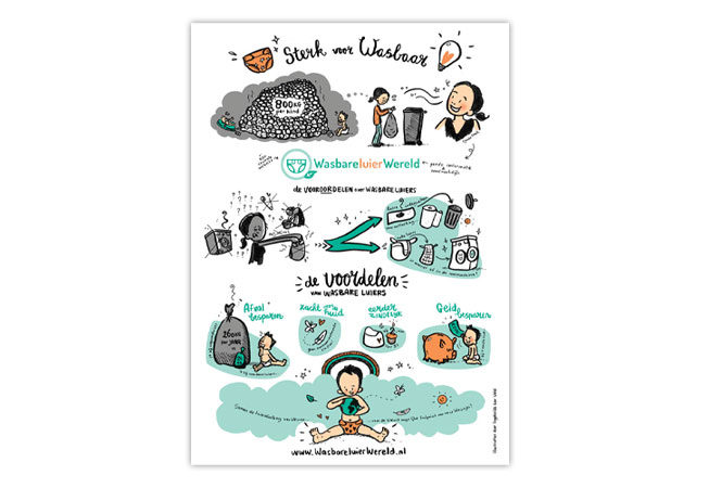 Voor de onafhankelijke vergelijkingswebsite WasbareluierWereld.nl maakte ik deze informatieflyer. Wist je dat je per kind, per zindelijkheidsperiode zo’n 800 kilo afval produceert door het gebruik van wegwerpluiers!?! Ik wist het eerlijk gezegd niet. Maar ik hoop dat deze flyer meehelpt aan het bijdragen aan het bewustzijn hiervan.